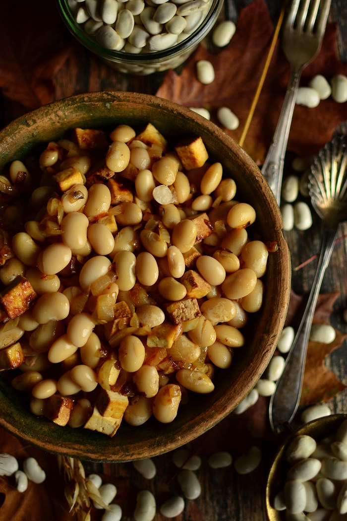 Moja wersja jest z duszoną cebulką, solą, pieprzem, majerankiem i wędzonym tofu. Zamiast tofu, można użyć skwarek z selera. Taka fasolka jest idealna do wszelkich kotletów, jako dodatek do obiadu.