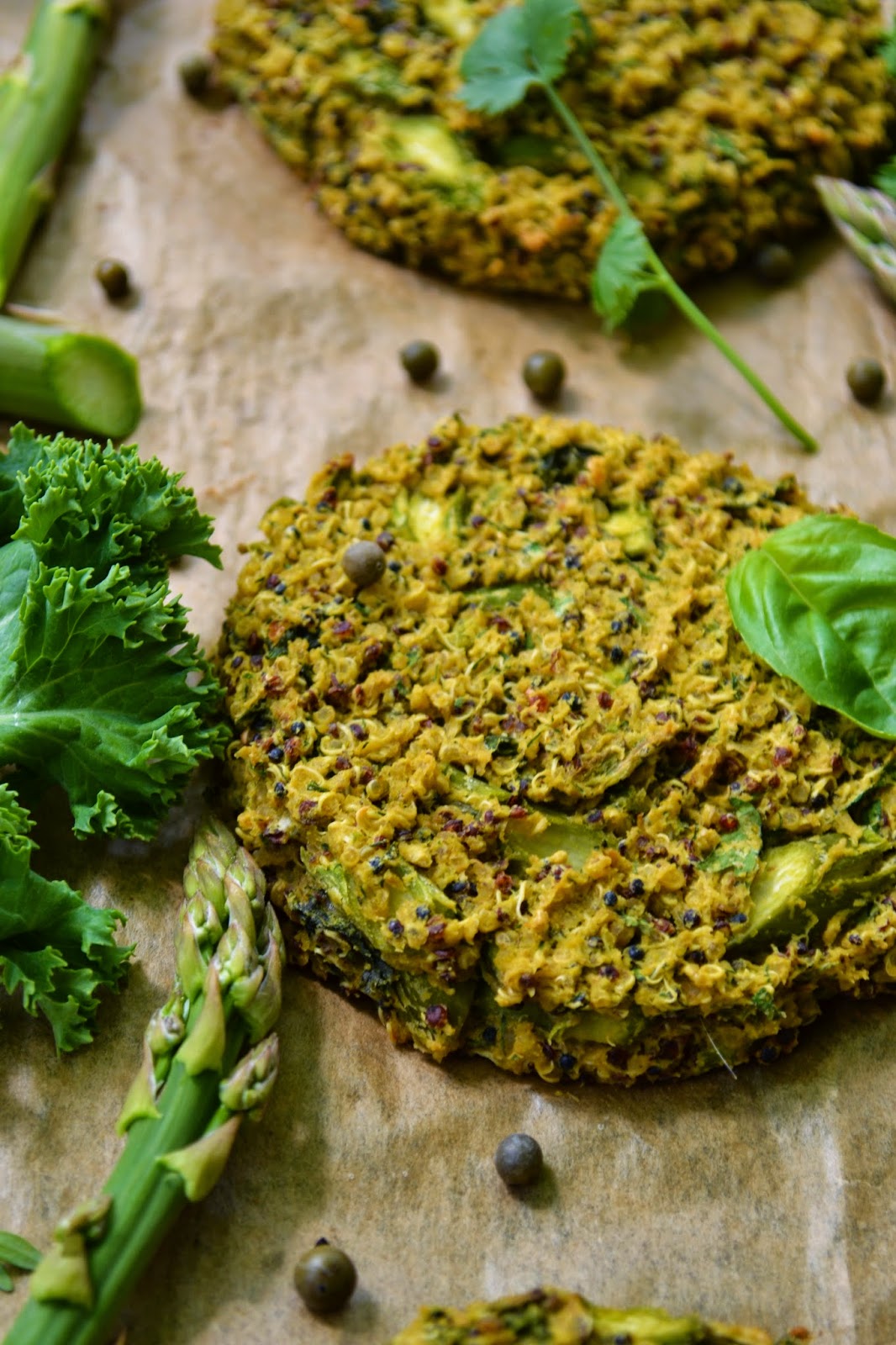 W moich burgerach wiosennych składnikiem spajającym jest ciecierzyca i komosa ryżowa. Ingrediencje ziołowe to pokrzywa, szczaw, jarmuż, kolendra, natka pietruszki, bazylia, koperek, lubczyk, tymianek i drobno posiekane zielone szparagi. Dodatkowego smaku nadaje przyprawa curry i mielony kmin rzymski.