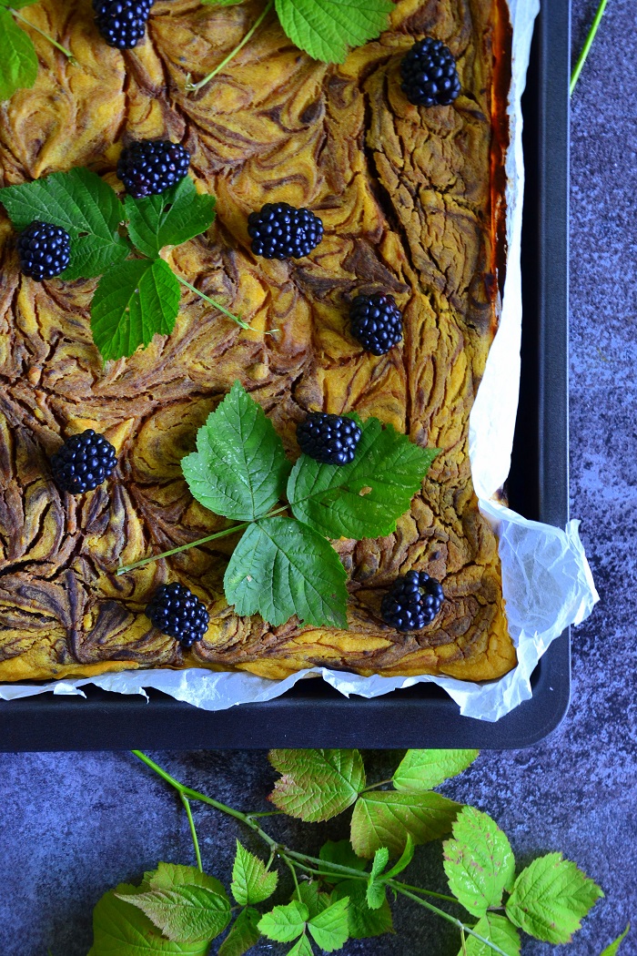 – piec w 175°C przez około 45-50 minut. Grzanie góra/dół, środkowa półka. Wyjąć z piekarnika. Odczekać 10 minut i ostrym nożem pokroić w kwadraty
