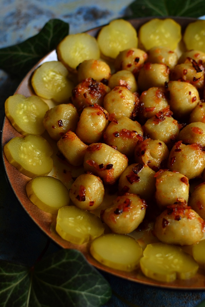 – delikatnie wyjmować łyżką cedzakową. Podawać ze zrumienioną cebulką, kiszonym ogórkiem, kiszoną kapustą lub sosem grzybowym. Można wyjąć z wody, odstawić by wystygły, a następnie wrzucić na patelnię z podsmażoną cebulką i wymieszać delikatnie. Do cebulki można dodać trochę wędzonej papryki, by nadać jej dymnego smaku