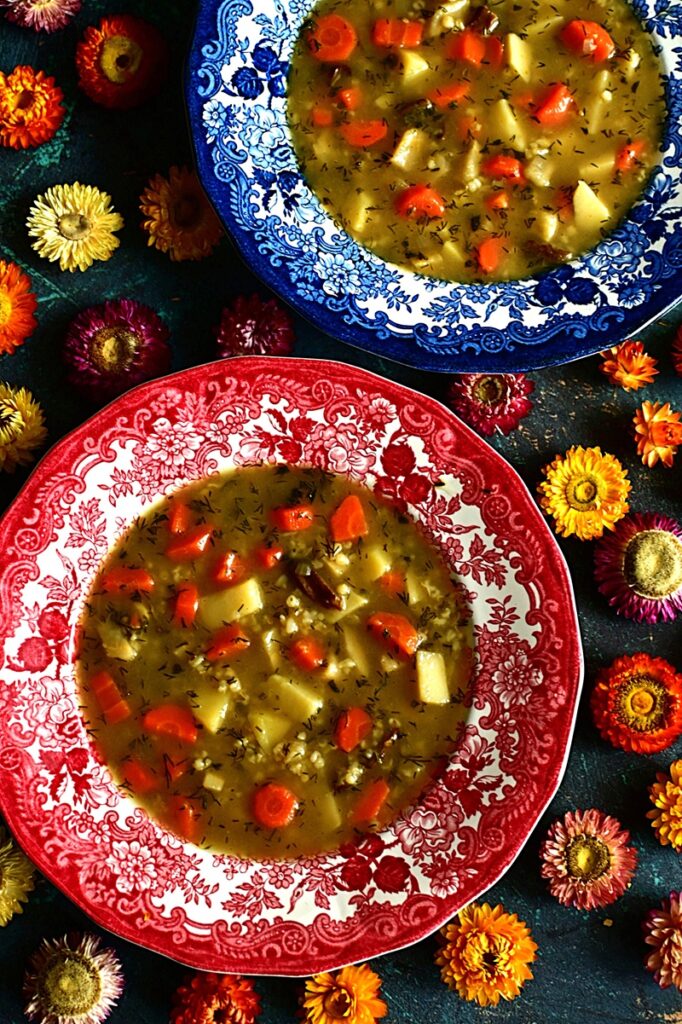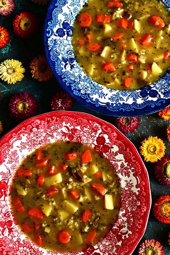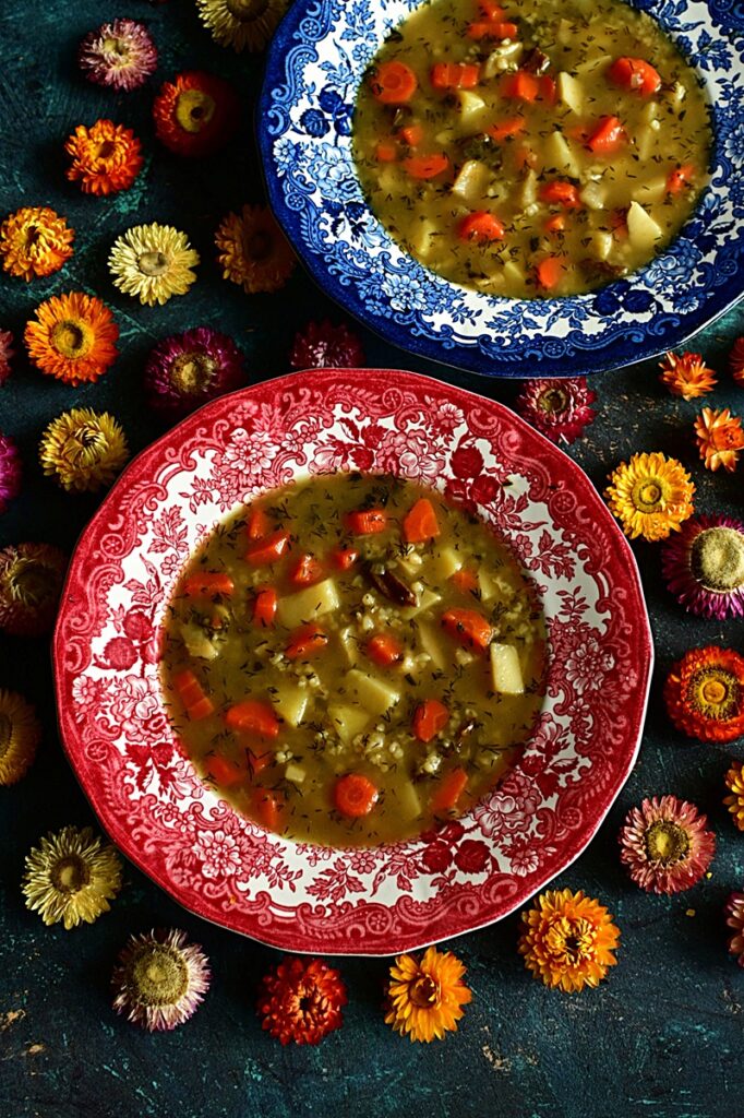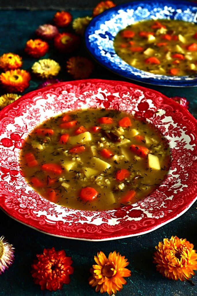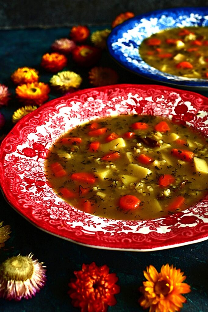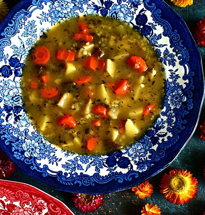 Kontynuuje Klasyki PRL, bo temat oczywiście nie jest wyczerpany i pojawi się jeszcze kilka przepisów. 44 część dotyczy jednej z najpopularniejszej zupy tamtych czasów. Krupnik, bo o nim mowa, był powszechny od przedszkoli, szkół, stołówek zakładowych czy barów mlecznych. Robiony z decydowanej większości na kaszy jęczmiennej średniej lub perłowej. Rzadziej gryczanej czy jęczmiennym pęczaku – te występowały raczej w kuchni regionalnej. Kasza dodawana niemal na końcu gotowania, by nie była zbytnio rozklejona. Najpierw robiono wywar z warzyw korzeniowych i przypraw, którymi najczęściej były liście laurowe i ziele angielskie. Nie brakowało również przyprawy maggi. Jeżeli były robione na wywarach mięsnych, to zazwyczaj na korpusach lub skrzydełkach drobiowych, a rzadziej na żołądkach. Czasami dodawano dla smaku suszone grzyby, choć to raczej w domowych kuchniach. Ilość kaszy była również nie bez znaczenia. Na stołówkach szkolnych i w przedszkolach, najczęściej krupnik był rzadki, bo cieci nie przepadały za gęstymi zupami. Inaczej było w stołówkach pracowniczych i barach mlecznych. Tu można było dostać często kit, w którym łyżka stawała. Ja krupnik wspominam z dzieciństwa jako zupę zdrowotną, gdy chorowałem na nerki i przyjmowałem spore ilości leków, które niezbyt działały na układ pokarmowy. Była zalecana ze względu na dobroczynny wpływ na jelita ze śluzów wydzielanych z kaszy, podczas gotowania. Choć ilość zwolenników krupniku jest równoważona jej przeciwnikami, to ja należę do tej pierwszej grupy. Uwielbiam i często gotuje.