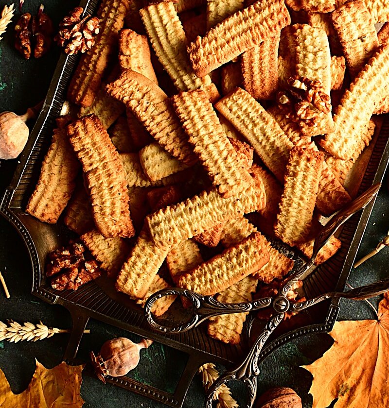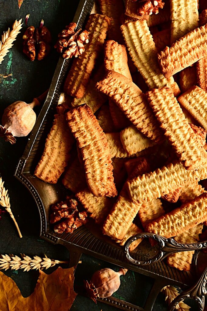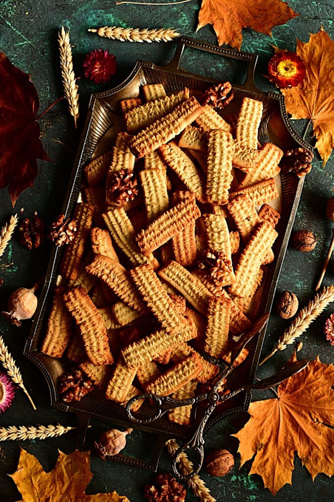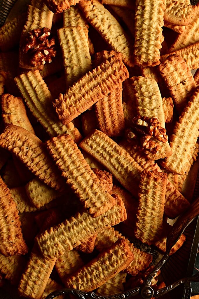 Lubię zmieniać klasyczne przepisy dla nowych smaków i tekstur. Podobnie jest z tym przepisem. Ciastka z maszynki to regionalny i klasyczny przepis, który już pojawił się już na blogu (PRZEPIS). Postanowiłem go trochę zmienić. Zamiast mąki pszennej, dodałem orkiszowej. Do masy również dodałem mielonych orzechów włoskich. Ta zmiana wyszła na lepsze ciastkom. Pozostały niezwykle kruche, a orzechowy smak nadał nowy wymiar. Bardzo ważne, by masę przed wytłoczeniem schłodzić i również wytłoczone ciastka. Powoduje to, że łatwiej się formują w maszynce (nie kruszą się) i są kruche oraz nabierają wyjątkowego smaku.