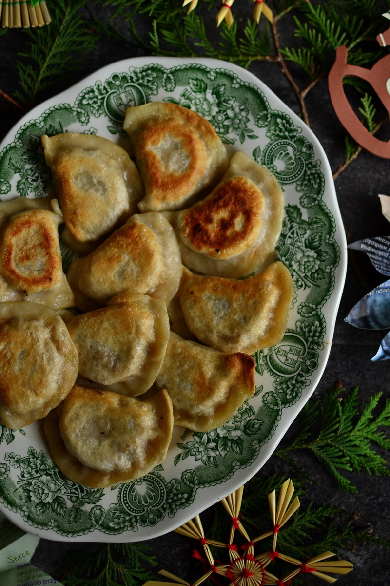 – w garbku rozgrzać tłuszcz, wkładać pierogi smażyć na lekko rumiano z obu stron. Odsączyć na papierowym ręczniku. Można posypać cukrem pudrem