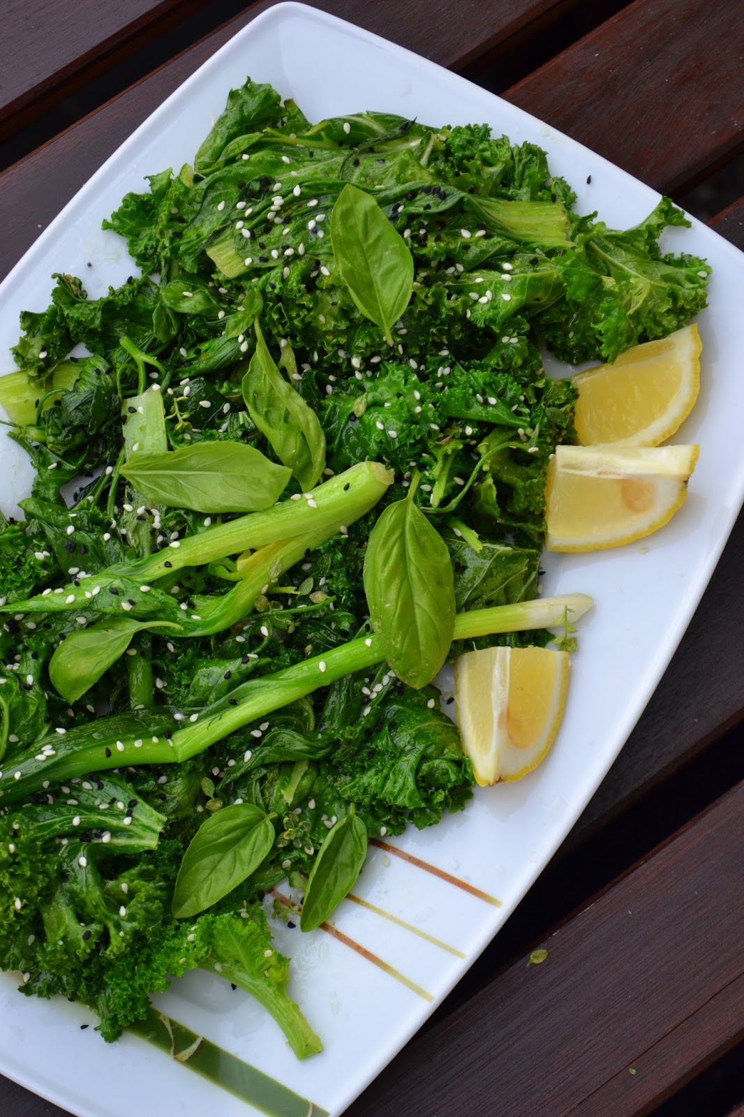 – dowolne liście: pach choi, jarmuż, seler, natka pietruszki, bazylia, botwinka, liście marchewki, młoda dymka, kapusta pekińska, liście rzodkiewki itd