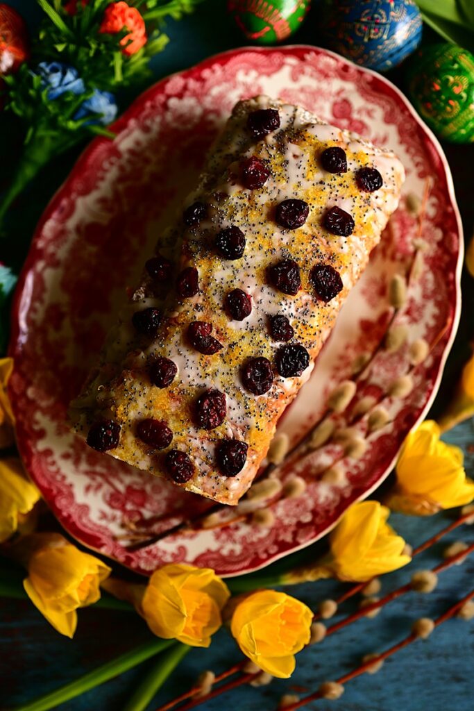 – wystudzić i polać lukrem cytrynowym. Można ozdobić żurawiną i makiem