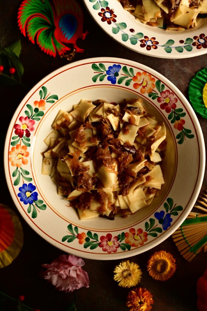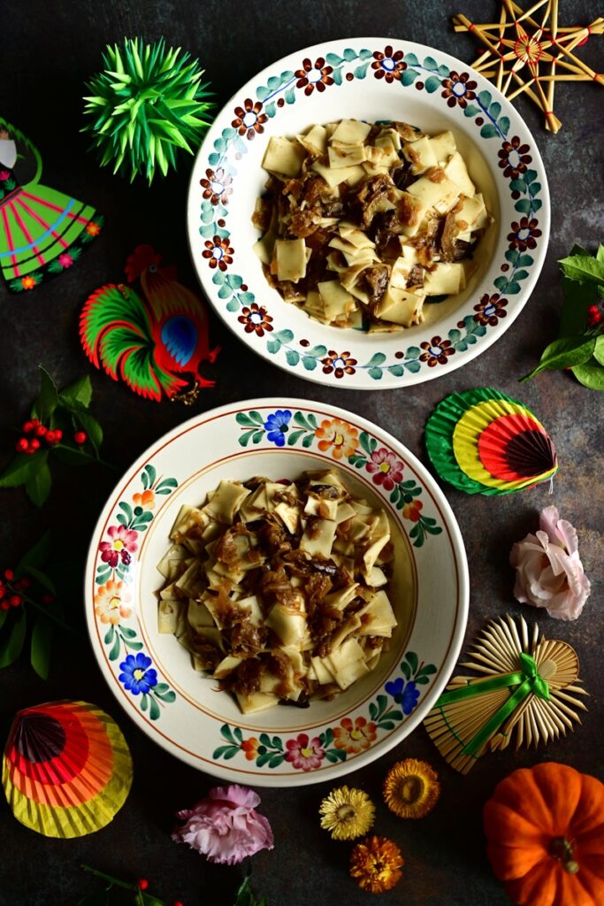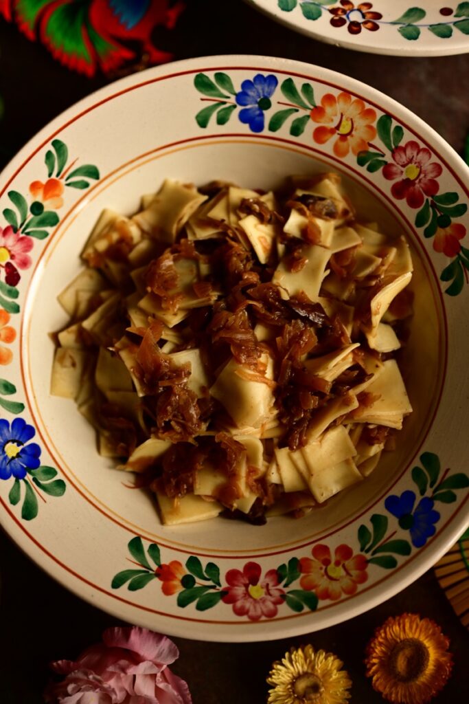 Różnorodność potraw wigilijnych, wynika z tradycji rodzinnych, ale również tradycji regionalnych. Każde województwo ma swoje propozycje, a nawet subregiony potrafią się różnić. Kolejne odmienne potrawy wynikają często z migracji społeczności. W jednej rodzinie potrafią być wpływy Kresów Wschodnich i Śląska, by w innej połączyć kuchnię Lubelszczyzny z Mazowszem. Jedną z potraw wigilijnych w niektórych domach, są łazanki z kapustą i grzybami. Mamy tu połączenie potraw z makaronem (np. z makiem) z kapustą i grzybami (np. z pierogami, kulebiakiem, krokietami). Do końca nie wiadomo jaka jest historia tej potrawy i skąd się wywodzi. Jedno jest pewne, że w województwie łódzkim, a dokładnie w gminie Andrespol w powiecie łódzkim wschodnim, łazanki z kapustą występują od czasów przedwojennych. Nazywają się dziadem kapuścianym i wersji z dodatkiem mięsa są potrawą codzienna, a postna właśnie podawana jest na wigilijnej kolacji. Do kapusty dodaje się tartej marchwi, które się razem dusi i dodaje do makaronu. Co by nie mówić, łazanki z kapustą są przepyszne i pozwalam sobie na nie bardziej w dni powszednie niż świąteczne.